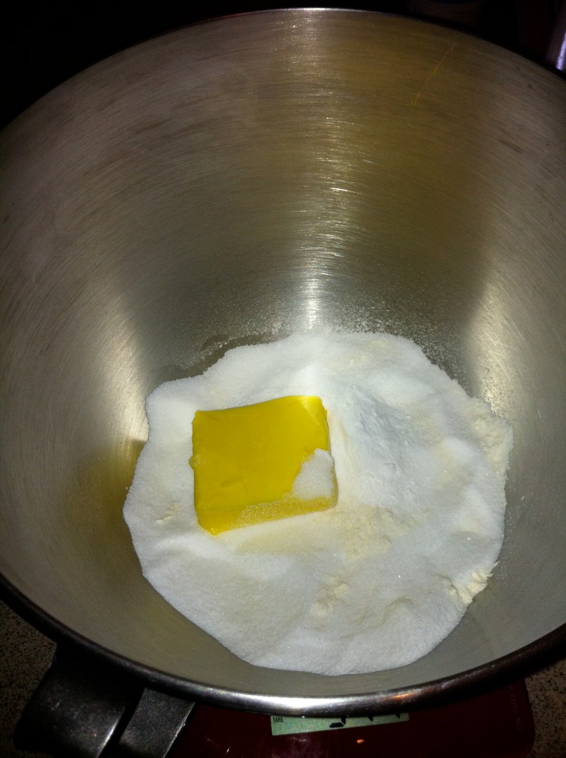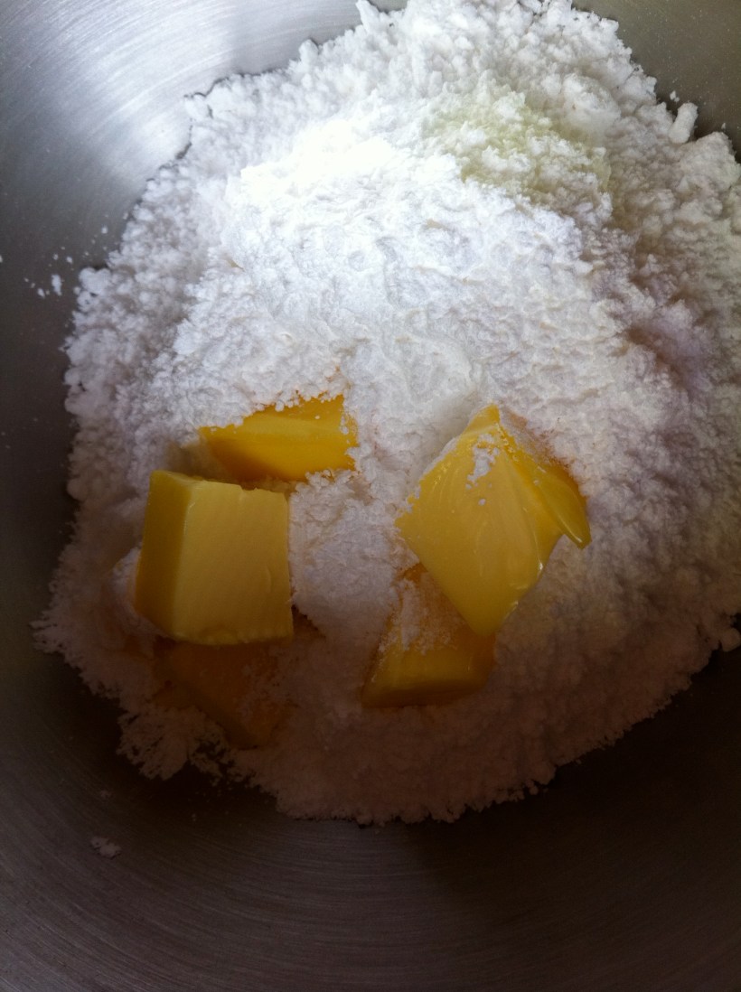 2.Mix flour, sugar, baking powder, salt and butter on low speed until you get a sandy consistency.