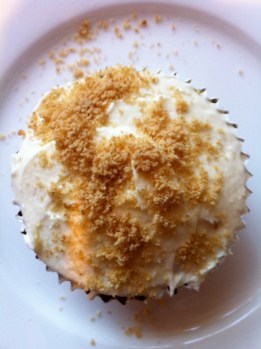 10. When cupcakes are cold spoon cream cheese frosting on top and finish with a sprinkling of the biscuits.