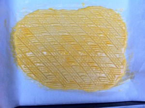 After an hour or so in the fridge, roll out between wax paper to 1/4 inch thick.