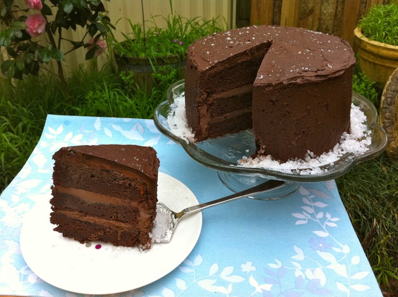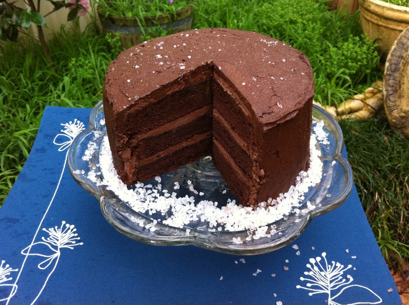 Place one cake layer on a serving platter. Spread 1/4 cup of the caramel over the top. Let the caramel soak into the cake, then spread 3/4 cup of the ganache frosting over the caramel. Sprinkle 1 teaspoon of the fleur de sel over the frosting, then top with e second cake layer. Spread with caramel frosting and sprinkle with 1 teaspoon of the fleur de sel. Then top with the third layer. Spread with caramel. Crumb coat the cake and put the cake in the refrigerator for 15 minutes to firm up the frosting. Frost the sides and top with the remaining frosting. Garnish with a sprinkle of fleur de sel.