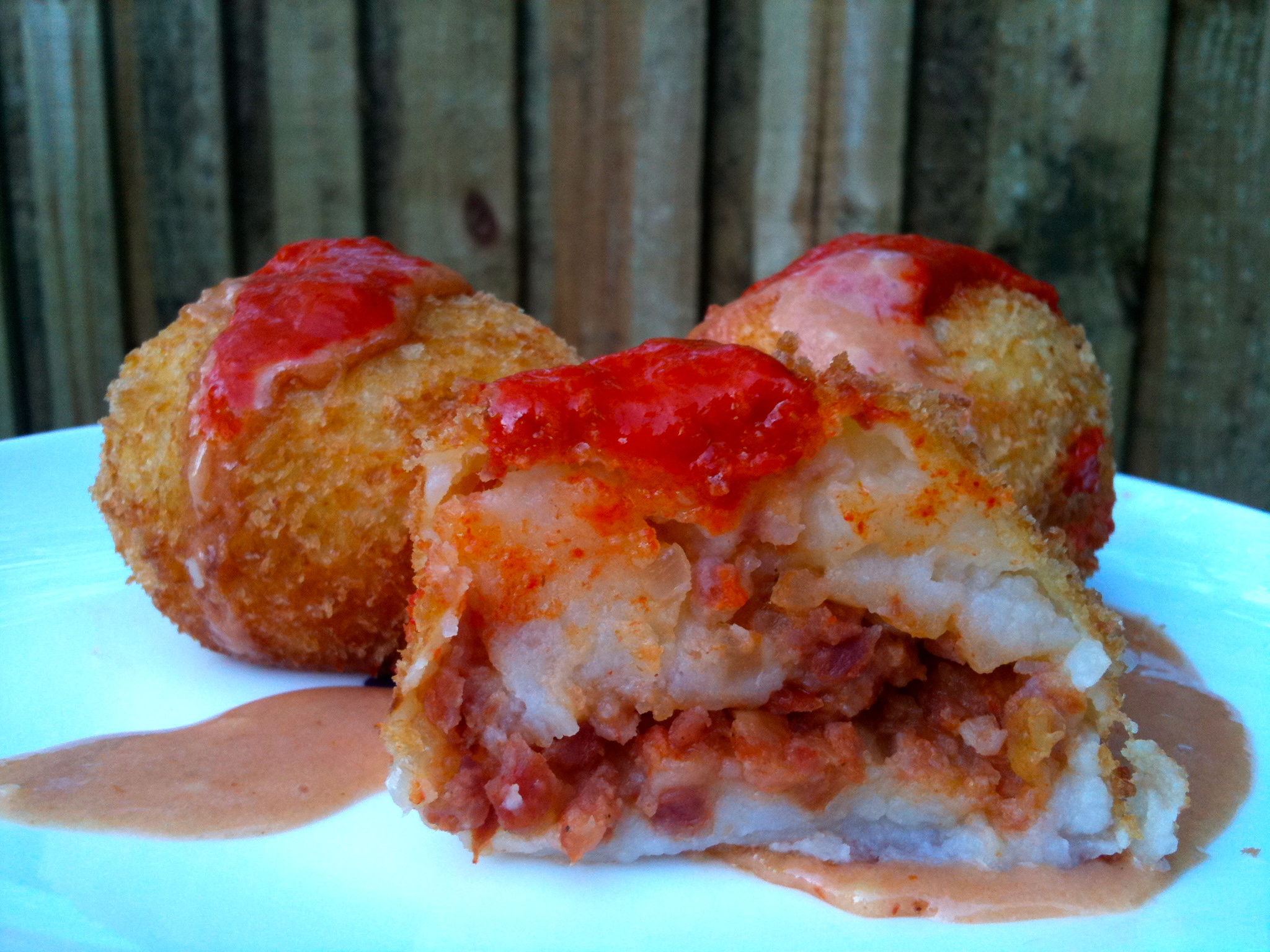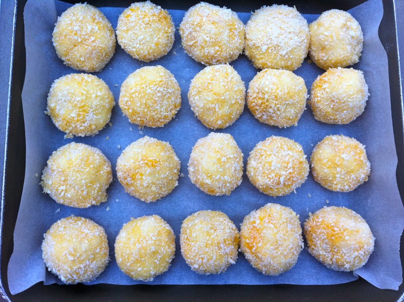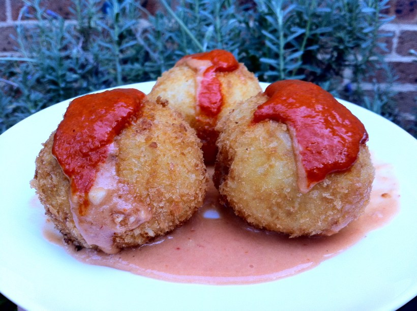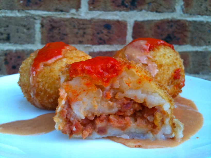 5. Roll 2 heaped tbs of the potato into a ball.  Using your index finger, make a small hole in the potato. Fill with 1 tsp of the cooled chorizo filling. Close the potato mixture around the filling and shape into a smooth ball. Repeat with remaining potato and filling.