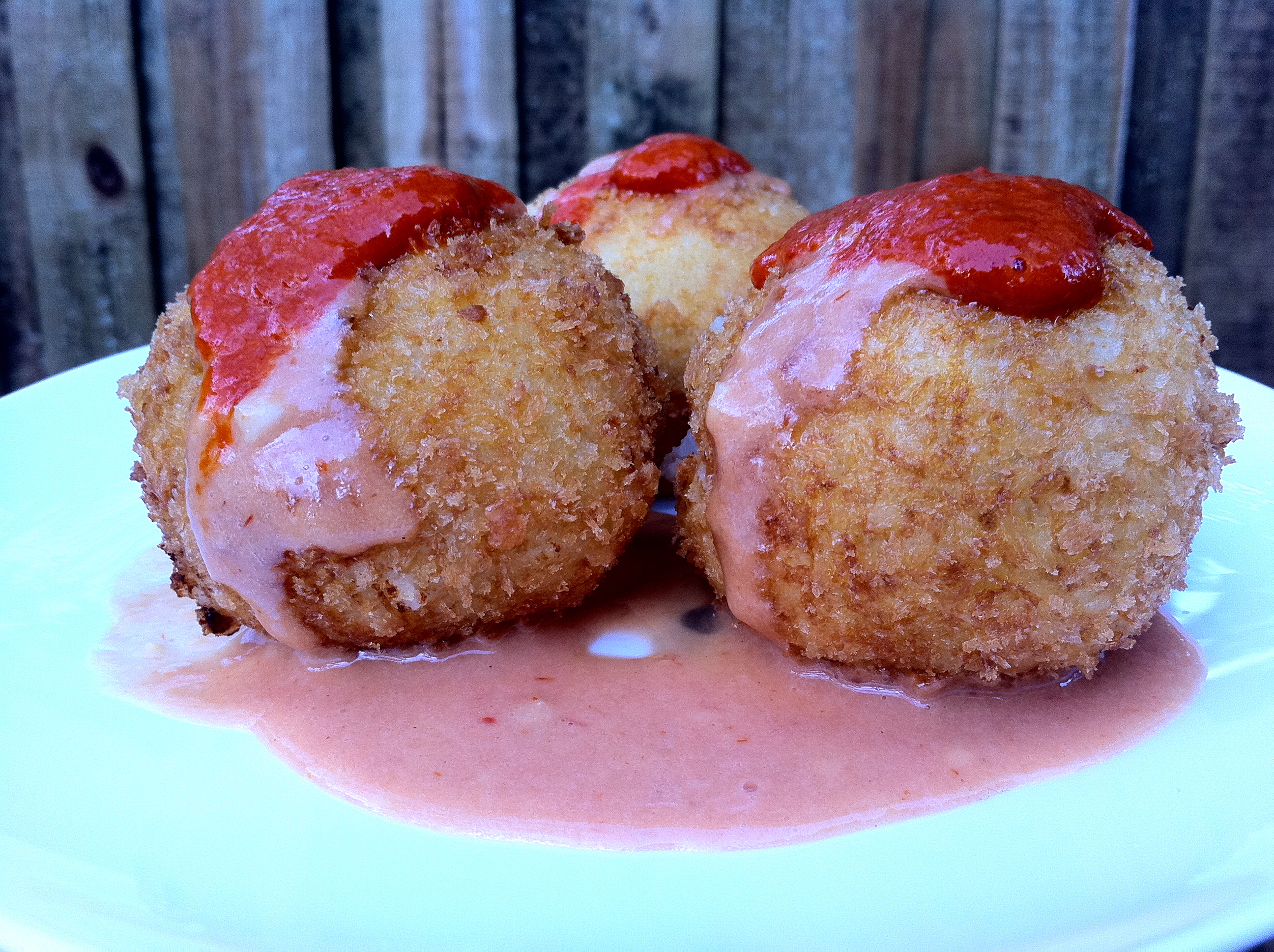 6. Coat potato balls in seasoned flour and shake off excess. Dip in egg, allowing excess to drain off. Coat well in the panko. Place onto a large plate or tray and refrigerate until ready to cook.