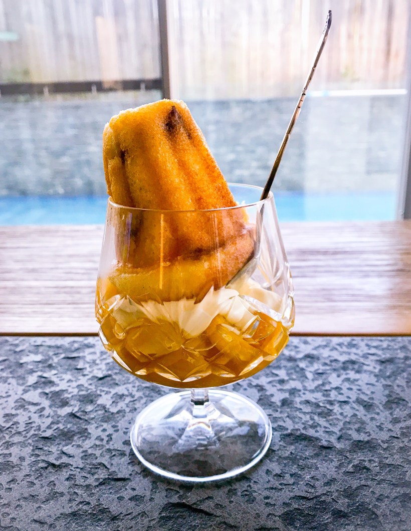 So I tried to pretend my glass a mini trifle bowl and I layered the recipe. The sautéed pineapple at the bottom, a dollop of cream, the kirsch baba and then spooned extra juice over the entire thing.